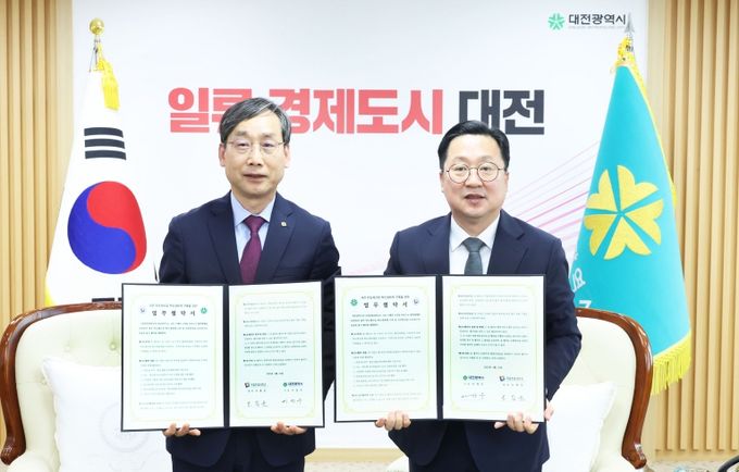 대전시와 국립한밭대학교는 4월 21일 시청 응접실에서 대전 반도체산업 혁신생태계 구축을 위한 업무협약(MOU)을 체결했다. 이날 협약식에는 이장우 대전시장과 오용준 국립한밭대학교 총장을 비롯해 관계자들이 참석했다.