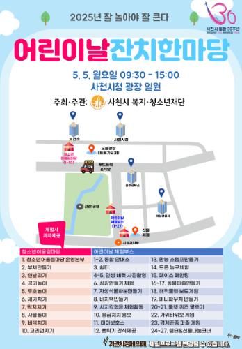 [경남도민뉴스=변정형 기자] 사천시 복지․청소년재단은 5월 5일 사천시청 광장 일원에서 ‘2025년 사천시 어린이날 잔치한마당’ 행사를 개최한다고 23일 밝혔다.
