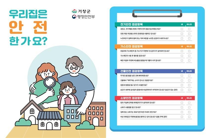 먼저 가정용 자율안전점검표를 32,000부를 제작해 읍면을 통해 전 세대에 배부했으며, 특히 안전취약계층인 어린이, 노인, 장애인 가정에서 반드시 자율 안전점검을 할 수 있도록 참여를 독려했다.