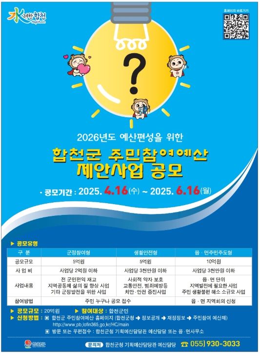 [경남도민뉴스=김춘호 기자] 합천군(군수 김윤철)은 2026년도 예산편성을 위한 주민참여예산 제안사업 공모를 6월 16일 까지 실시 한다고 밝혔다.