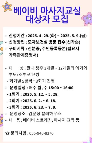 [경남도민뉴스=백형찬 기자] 거창군은 4월 29일부터 5월 9일까지 베이비 마사지교실에 참여할 대상자 15쌍을 모집한다.