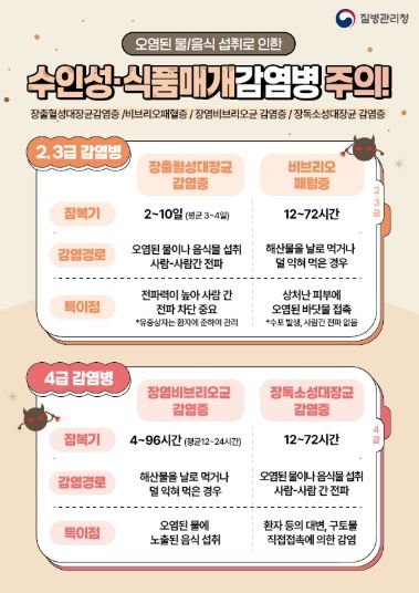 수인성·식품매개 감염병은 세균성 이질, 콜레라, 장티푸스, 장출혈성대장균감염증 등으로 오염된 물이나 덜 익힌 음식 등을 통해 감염될 수 있다.