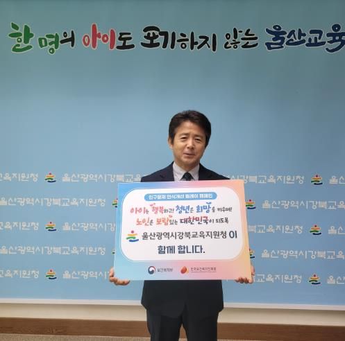 [경남도민뉴스=최재경 기자] 황재윤 울산 강북교육지원청 교육장이 13일 보건복지부와 한국보건복지인재원이 공동 기획해 추진하는‘인구문제 인식개선 참여 잇기’ 홍보 활동(캠페인)에 동참했다.