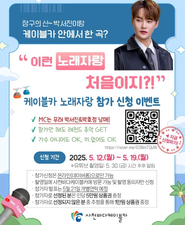 한편, 이번 이벤트는 2025 사천 방문의 해를 기념해 지역 관광 활성화와 사천바다케이블카의 매력을 널리 알리기 위해 기획됐다. 해당 콘텐츠는 박서진 유튜브를 통해 공개될 예정이며, 케이블카 노래자랑 MC는 박서진과 박효정 남매가 맡는다.