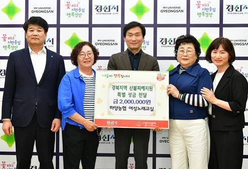 [경남도민뉴스=최민숙 기자] 하양농협 여성노래교실은 14일 경산시청을 방문하여 최근 발생한 산불로 어려움을 겪고 있는 이웃들을 돕기 위해성금 200만원을 기탁했다.
