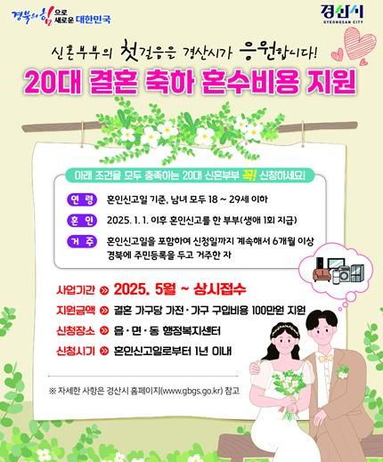 [경남도민뉴스=최민숙 기자] 경산시는 일찍 결혼하고 아이를 낳을 수 있는 여건을 조성하고자 19일부터 20대 신혼부부를 대상으로 결혼 축하 혼수비용 지원사업을 실시한다.