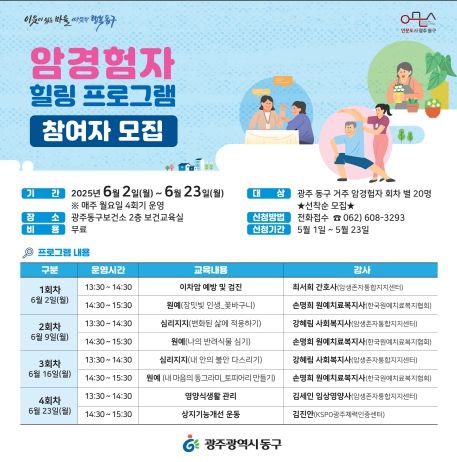 [경남도민뉴스=최현인 기자] 광주 동구는 6월 2일부터 관내 암 경험자를 대상으로 암 경험자 힐링 프로그램을 진행한다고 밝혔다.
