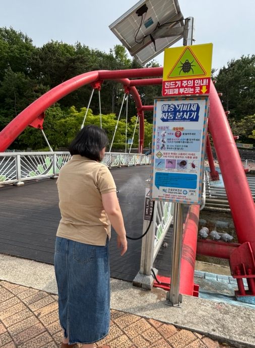 또한, 자동분사기가 눈에 잘 띄도록 진드기 그림과 경고 메시지를 담은 안내판을 장비에 부착하여 경각심과 기피제 분사를 유도했다.