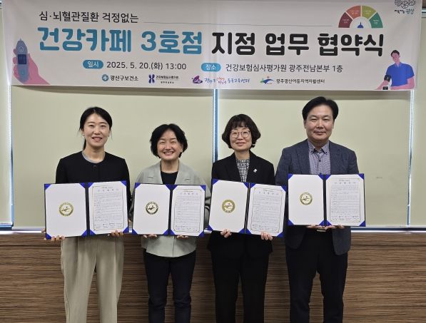 [경남도민뉴스=최현인 기자] 광주 광산구가 건강보험심사평가원 광주전남본부와 광산어등지역자활센터가 운영하는 카페 ‘딜라잇가든(무진대로 210)’을 건강카페 3호점으로 지정하고 인증패를 전달했다.