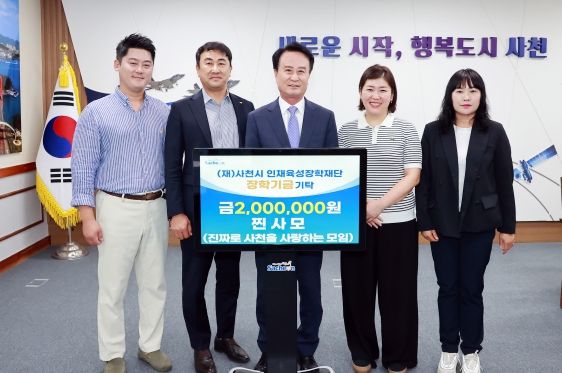 [경남도민뉴스=변정형 기자] 찐사모(진짜로 사천을 사랑하는 모임, 회장 빈재옥)가 21일 (재)사천시인재육성장학재단에 200만 원의 장학금을 전달했다.