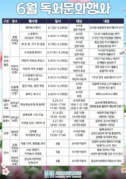 특히, 호국보훈의 달을 맞아 전쟁과 평화를 주제로 한 도서 전시, 사천시 통합 30주년을 기념한 관련 도서 전시도 마련돼 깊이 있는 독서의 시간을 제공한다.