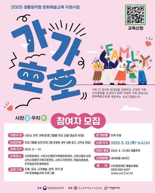 [경남도민뉴스=변정형 기자] 사천문화재단은 22일부터 2025년 생활밀착형 문화예술교육 지원사업 '가가호호(家加好好)' 프로그램에 참여할 가족을 모집한다.