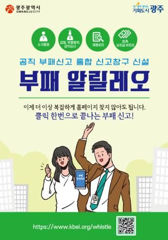 [경남도민뉴스=최현인 기자] 광주광역시는 공직사회 부패행위를 근절하고 시민의 신고 접근성을 높이기 위해 통합 신고시스템 ‘부패 알릴레오’를 구축하고, 6월1일부터 본격 운영한다.