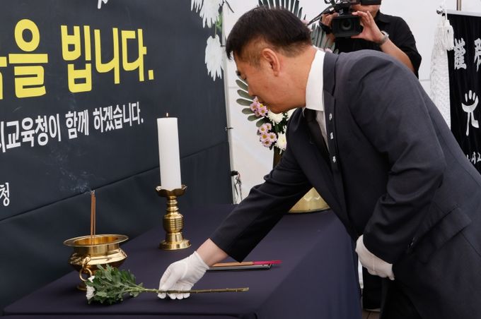 이날 추모식에는 이정선 교육감을 비롯해 시교육청 간부 공무원이 참석해 숨진 교사를 애도하고, 헌화와 묵념을 했다.