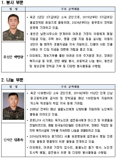 봉사 부문 수상자 박헌규 씨는 2015년부터 육군 제3기갑여단 ‘불곰장학회’ 활동을 통해 생계가 어려운 가정 아동에게 매달 지원금을 전달하고, 주택 보수, 명절 선물 지원 등 실질적인 생활 지원을 꾸준히 이어오고 있다.