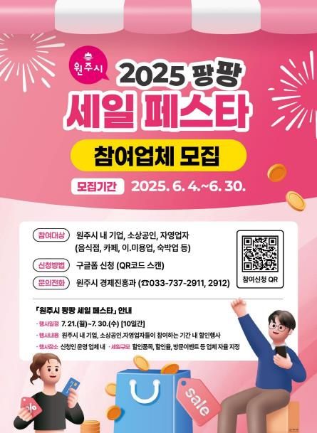 박경희 경제진흥과장은 “올해 처음 개최되는 ‘원주시 팡팡 세일 페스타’가 관내 기업, 소상공인과 자영업자들에게 실질적인 도움이 될 수 있도록 최선을 다해 준비하겠다.”라며 “시민 여러분의 많은 관심과 적극적인 참여를 부탁드린다.”라고 전했다.