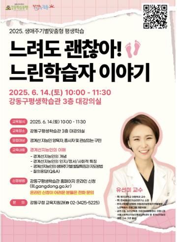 [경남도민뉴스= 기자] 강동구는 오는 6월 14일 강동구평생학습관에서 느린 학습자 양육자 교육 ‘느려도 괜찮아! 느린 학습자 이야기’ 특강을 개최한다고 밝혔다.
