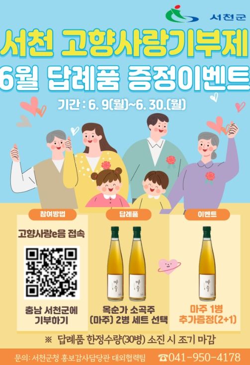 이벤트 기간은 오는 6월 9일부터 30일까지로, 해당 기간 동안 서천군에 10만원 이상 기부하고 옥순가 소곡주(마주) 2병 세트를 답례품으로 선택한 기부자에게 소곡주 1병을 추가로 증정한다.