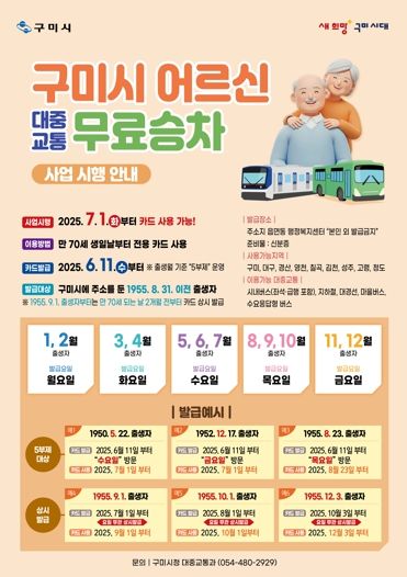 이를 위해 구미시는 6월 11일부터 ‘통합무임 교통카드’ 발급을 시작한다. 발급은 출생월에 따른 ‘5부제’ 방식으로 요일별 일정을 적용해, 어르신들이 혼잡 없이 편리하게 카드를 받을 수 있도록 운영할 계획이다.