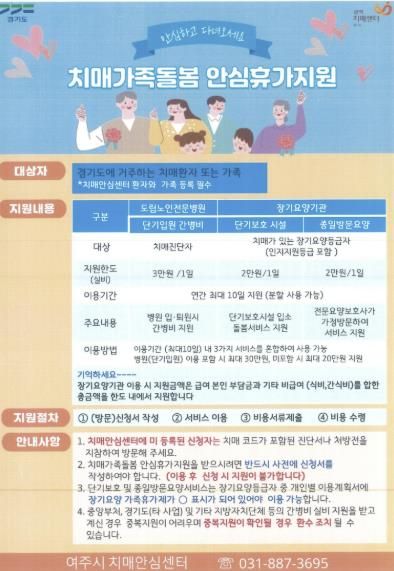 지원대상은 여주시치매안심센터에 등록된 치매환자 및 가족이며, 단기입원 간병비 1일 최대 3만 원씩 최대 30만원까지, 단기보호나 종일방문요양 서비스 이용 시 1일 최대 2만 원씩 최대 20만원까지 지원하고 있다. 이용기간은 연간 최대 10일이며 분할 사용도 가능하다.