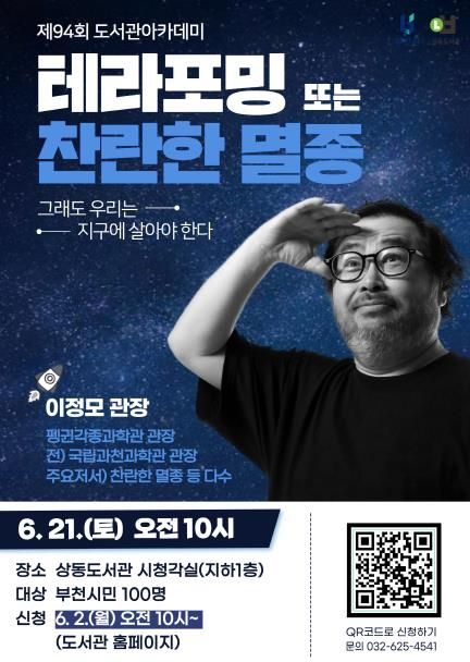 [경남도민뉴스= 기자] 부천시 상동도서관은 6월 21일 오전 10시부터 12시까지 ‘찬란한 멸종’의 저자이자 전 국립과천과학관장인 이정모 관장을 초청해 ‘제94회 도서관 아카데미’를 개최한다.