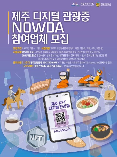제주특별자치도와 제주관광공사는 오는 6월 12일 오후 2시 제주웰컴센터 1층 라운지에서 도내 관광업계 등을 대상으로 ‘제주 디지털관광증 NOWDA(나우다)’ 사업 소개 및 참여업체 모집을 위한 사업설명회를 개최한다고 9일 밝혔다.