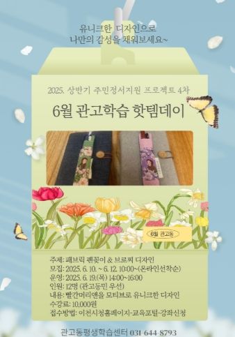 6월 ‘관고학습 핫템데이’는 추억 속의 애니메이션 '빨간 머리 앤'을 모티브로 생활 속의 아이템인 패브릭 펜꽂이, 브로치 등을 디자인하여 평생학습을 통한 자신만의 라이프스타일로 자신감과 트렌드 리더로서의 특별한 감성을 선사할 계획이다. 자세한 일정은 이천시청 누리집 공지사항 및 교육포털을 통해 확인할 수 있다.