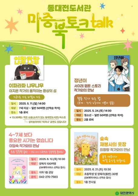 이번 행사는 대전광역시 OK예약서비스 누리집을 통해 사전 신청이 가능하며, 자세한 내용은 동대전도서관 정보서비스팀으로 문의하면 된다.