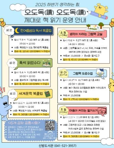 신방도서관 관계자는 “시민들이 참여할 수 있는 다양한 요일과 시간대로 프로그램을 운영해 책을 가까이할 수 있는 하반기가 되기를 바란다”고 말했다.