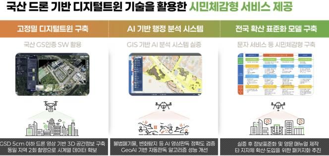 고정밀 국산 드론과 인공지능(AI) 기술을 접목해 도시 공간의 정밀 데이터를 수집하고 이를 기반으로 한 행정서비스 고도화를 목표로 하는 것이 특징이다.