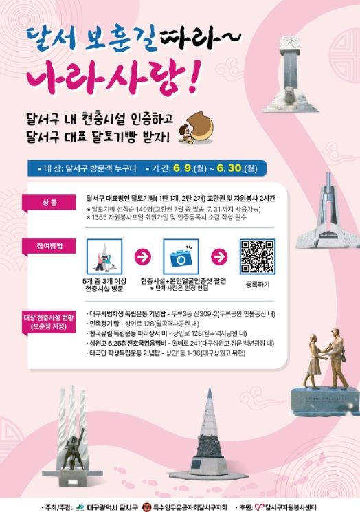 [경남도민뉴스= 기자] 대구 달서구는 6월 호국보훈의 달을 맞아 지역 현충시설을 탐방하고 인증하면 특산물 교환권과 자원봉사 시간이 주어지는 ‘달서 보훈길 따라~ 나라사랑!’ 이벤트를 운영한다.