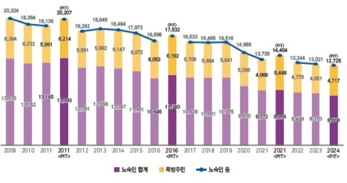 2024년도 노숙인 등의 실태조사 주요 결과는 2024년 전국 노숙인 등 수는 12,725명으로 2021년 대비 1,679명(△11.6%) 감소했다.