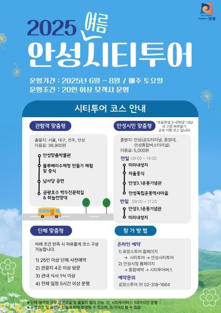 [경남도민뉴스= 기자] 안성시가 여름 관광 성수기를 맞아 6월부터 8월까지 운영되는 안성시티투어 ‘여름 시즌 코스’를 개시했다고 밝혔다.