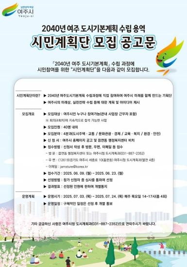 [경남도민뉴스= 기자] 여주시는 2040 도시기본계획 수립에 참여할 시민계획단을 6월9일부터 6월23일까지 모집한다고 밝혔다. 시민계획단은 도시의 미래상을 설정하고, 분야별 추진 전략을 논의하는 과정에 직접 참여하는 역할을 맡는다.