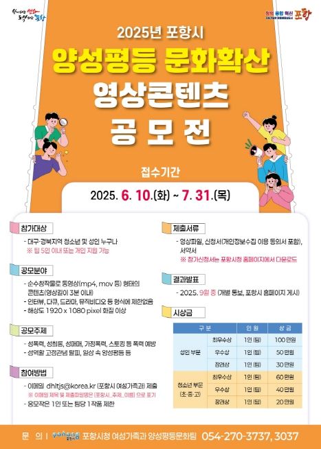 [경남도민뉴스= 기자] 포항시는 10일부터 내달 31일까지 양성평등에 대한 사회적 인식을 높이고 성평등 문화를 일상 속에 정착시키기 위해 ‘2025년 포항시 양성평등 문화 확산 영상 콘텐츠 공모전’을 개최한다.