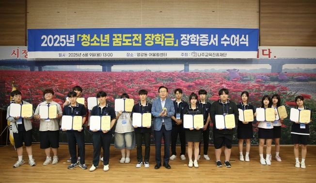 [경남도민뉴스= 기자] 나주교육진흥재단(이사장 윤병태)은 지난 9일 ‘2025년 청소년 꿈도전 장학금’에 선발된 나주시 중·고등학생 81명(중학생 41, 고등학생 40)에게 1인당 최대 100만 원씩 장학금 총7천 973만4천원을 지급했다고 10일 밝혔다.