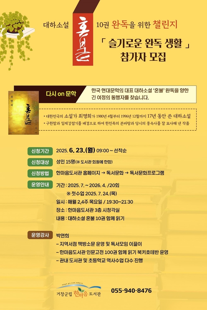 [경남도민뉴스=백형찬 기자] 거창군은 오는 23일부터 한마음도서관 홈페이지를 통해 대하소설 완독 챌린지 ‘슬기로운 완독 생활-혼볼’의 참여자 15명을 선착순 모집한다.