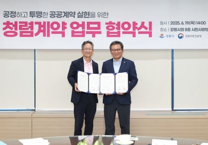[경남도민뉴스=류종길 기자] 강릉시와 강원지방조달청(청장 이경원)이 19일 오후 2시 시청 8층 시민사랑방에서 공공계약 투명성 강화와 청렴문화 확산을 위한 ‘청렴 업무협약’을 체결한다.