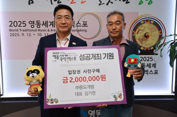 [경남도민뉴스=박만수 기자] ㈜중도개발 김기련 대표는 지난 24일 영동세계국악엑스포 입장권 구매를 위한 성금 200만원을 영동군에 전달했다.