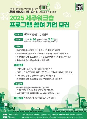 [경남도민뉴스=하형수 기자] 제주특별자치도와 제주관광공사(사장 고승철)는 오는 11월 21일까지 도외 민간기업 및 공공기관, 단체 등을 대상으로 ‘2025년 기업 워크숍 유치프로그램(JEJU Workshop)을 운영하고 있다고 1일 밝혔다.