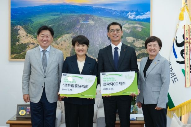 오영훈 지사는 3일 오전 도청 집무실에서 ‘2025년 지역과 상생하는 친환경우수골프장’으로 선정된 스프링데일골프앤리조트와 한화호텔&리조트 플라자CC제주에 인증패를 수여했다.