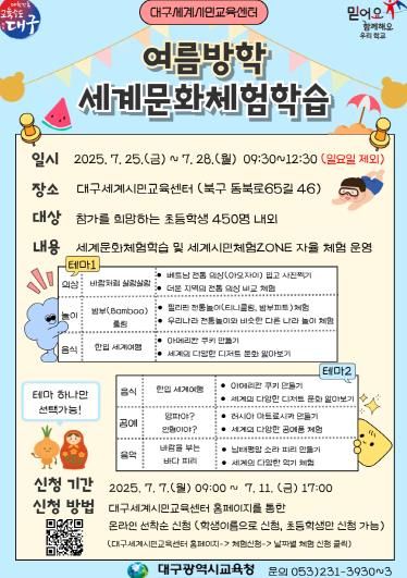 [경남도민뉴스=백상현 기자] 대구시교육청은 여름방학을 맞아 7월 25일, 7월 26월, 7월 28월 등 3일에 걸쳐 대구세계시민교육센터에서 초등학생을 위한 ‘여름방학 세계문화체험학습’ 행사를 운영한다고 밝혔다.