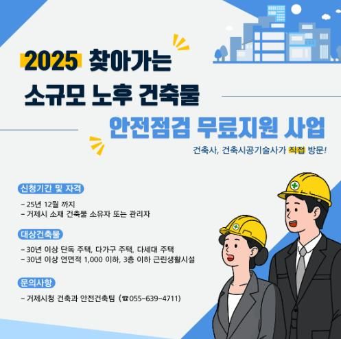 거제시 관계자는 “건축물에 대한 적극적인 안전 점검 및 관리는 매우 중요하며, 특히 노후 건축물일수록 더욱 세심한 관심과 점검이 필요하다”며 “많은 시민들의 적극적인 관심과 신청을 바란다”고 말했다.