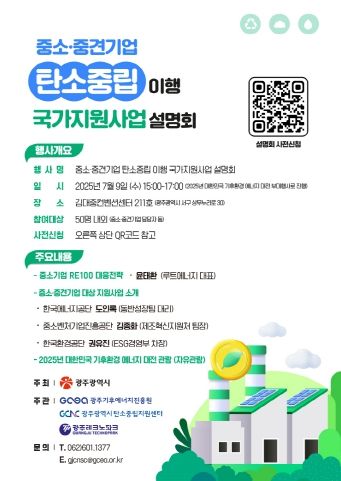 [경남도민뉴스=최현인 기자] 광주광역시는 광주기후에너지진흥원, 광주테크노파크와 함께 오는 9일 오후 3시 김대중컨벤센센터에서 ‘중소·중견기업 탄소중립 이행 국가지원사업 설명회’를 개최한다.