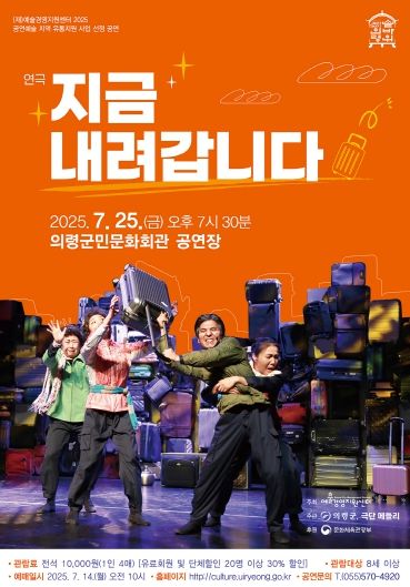 [경남도민뉴스=이상민 기자] 의령군은 오는 25일 오후 7시 30분 의령군민문화회관 공연장에서 귀농 귀촌 코믹 음악극 ‘지금 내려갑니다’ 공연을 무대에서 선보인다고 밝혔다.