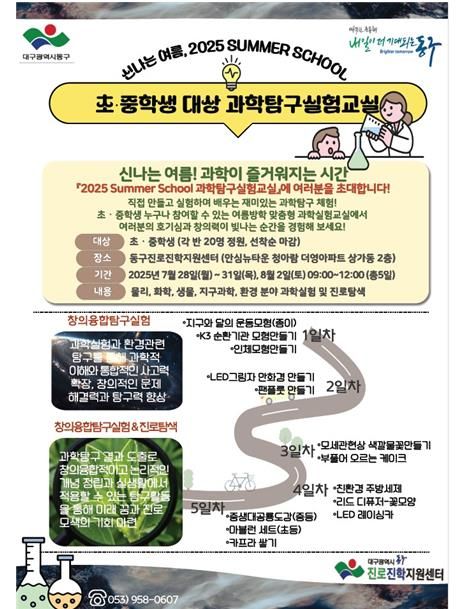 [경남도민뉴스=백상현 기자] 대구 동구청은 여름방학을 맞아 관내 초‧중학생을 대상으로 2025 Summer School ‘과학탐구실험’ 진로체험 프로그램을 운영한다.