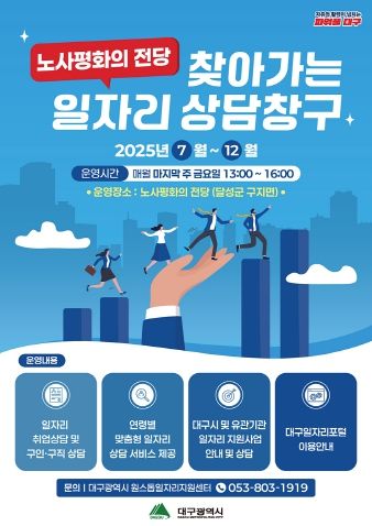 [경남도민뉴스=백상현 기자] 대구광역시는 매월 마지막 주 금요일 오후 1시부터 4시까지, 달성군 구지면에 위치한 노사평화의 전당에서 ‘찾아가는 일자리 상담창구’를 운영한다.