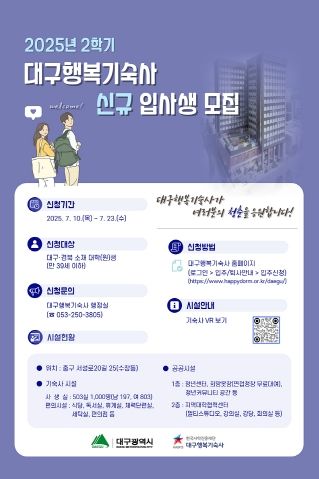 신청기간은 7월 10일부터 23일까지이며, 대구행복기숙사 홈페이지에서 회원가입 후 신청할 수 있다. 자세한 내용은 홈페이지 내 공고문에서 확인할 수 있으며, 입사 관련 문의는 대구행복기숙사 행정실로 하면 된다.