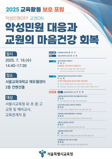 [경남도민뉴스=류종길 기자] 서울특별시교육청은 오는 7월 16일, ‘악성민원 대응과 교원의 마음건강 회복’을 주제로 서울교육대학교 에듀웰센터 컨벤션홀에서'2025 교육활동 보호 포럼'을 개최한다.