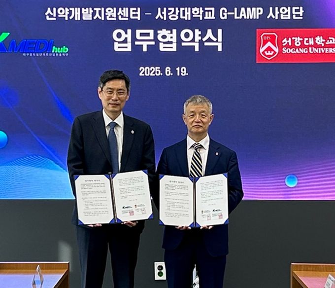 [경남도민뉴스=백상현 기자] 케이메디허브 신약개발지원센터와 서강대학교 G-LAMP 사업단이 전략적 신약개발 협력을 위해 업무협약(MOU)를 체결했다.